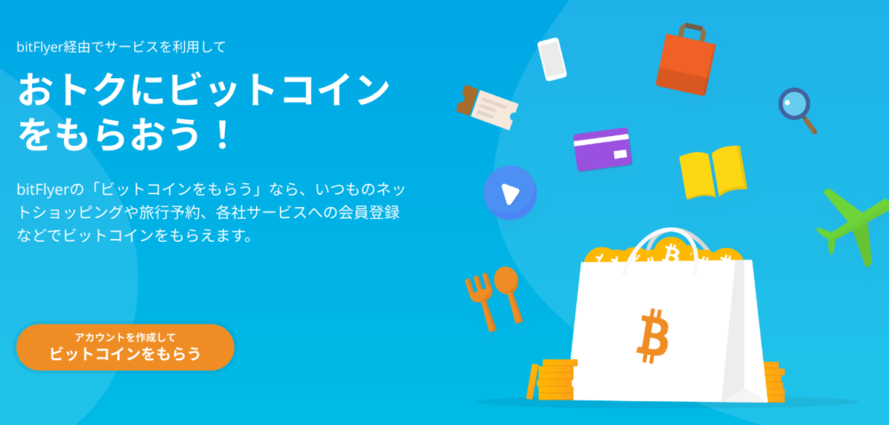 ビットフライヤーを経由して他社サイトを利用することでビットコインがもらえるサービスがあります。たとえば、楽天市場やYahooショッピングで買い物をすれば、購入額の数%にあたるビットコインが手に入ります。