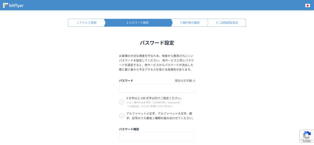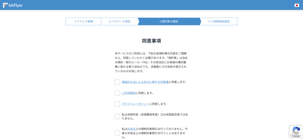アカウントを登録し、ビットフライヤーにログインできるようにするには、次の手順をこなしていきます。