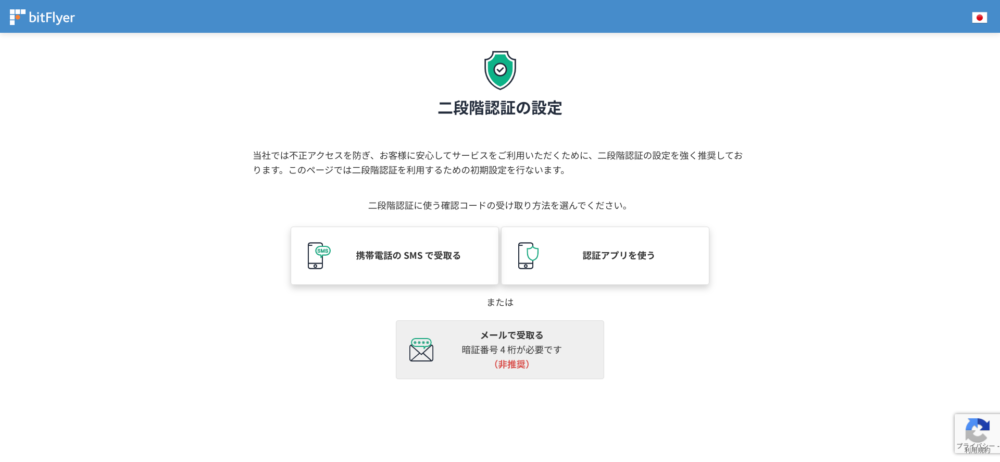 二段階認証の設定が必須なので、3通りの方法から1つ選びましょう。