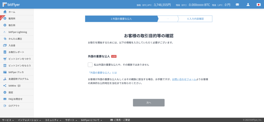 取引目的や財務情報、職業といった質問に回答していきます。ここで答えた内容によって、一部サービスの利用が制限される可能性があります。