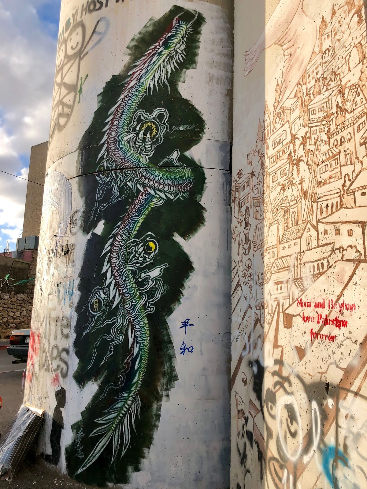 國分さん:僕は基本的に、隔たれていたり繋がっていなかったりする部分がひとつになるためのきっかけを作りたいと思っています。龍を描き続けているのもそれが理由です。イスラエルとパレスチナも民族や宗教が複雑に絡んでいて、世界で一番繋がってない場所のひとつです。そこがどうなっているのかと思い現地の状況を見たところ、難民キャンプは壁とか道がとても汚れていました。スプレーで落書きされているんですよね。